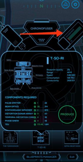 - Short tap on a blueprint — opens the CHRONOFUSER production window.